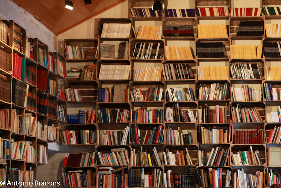 As “estantes” que se fixam às paredes, não são mais que antigas caixas de fruta, em madeira, que agora já não se podem utilizar como tal, apenas as de plástico. As caixas vão do chão quase ao telhado, são mais de mil, repletas de livros dos mais variados temas e línguas.