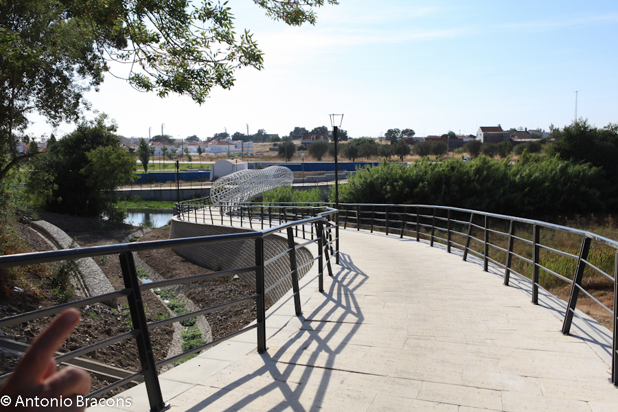 A extensão verde, arborizada, dá continuidade ao rio, é entrecortada por caminhos, liga a ribeira à cidade, une a cidade na sua extensão, reforçada por um conjunto de painéis de azulejos, decorativos, da autoria de Leonel Moura, tal como a ponte pedonal.