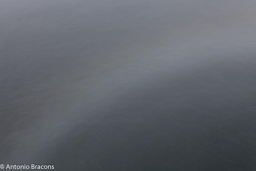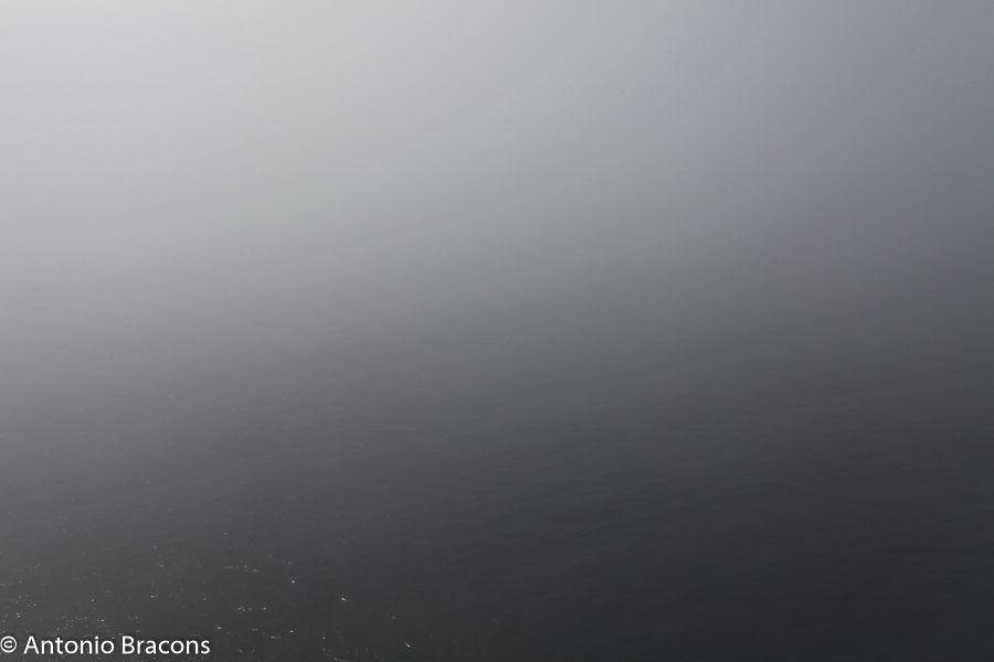 A neblina eleva-se do mar, adensa-se com a distância.