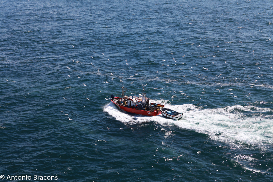 Vem um barco de pesca. Um bando de gaivotas acompanha-o: o peixe que não interessa para a lota é lançado ao mar, um verdadeiro manjar.