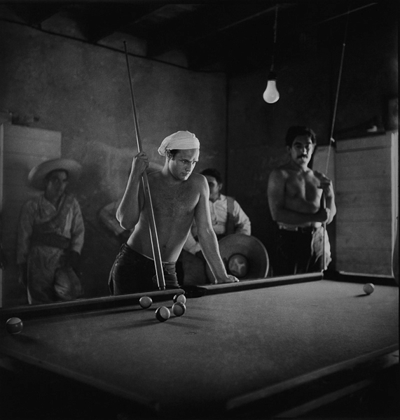 Sam Shaw, Marlon Brando e Anthony Queen jogando bilhar numa pausa da filmagem de Viva Zapata!, Texas, 1951