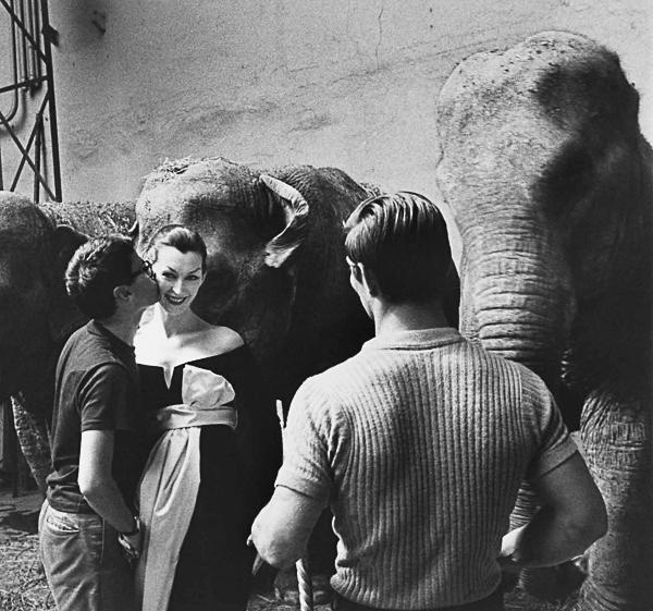 Sam Shaw, Richard Avedon e a modelo Dovima junto aos elefantes do Cirque d’Hiver, agosto 1955