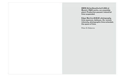 Este trabalho segue o percurso de estudo, ensaio e concretização de um novo modelo automóvel, da BMW, o qual fica concluído numa contagem para um momento 00:00:00, que implica a conclusão do modelo. É esse momento de concretização que dá o nome ao projeto e ao livro.