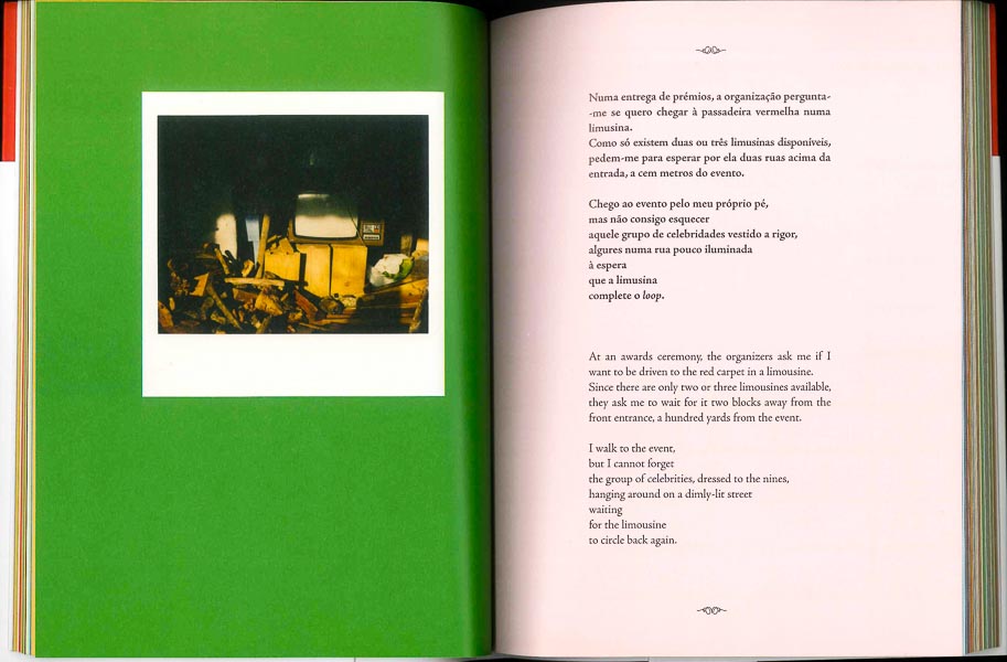 Este é um livro de fotografias Polaroid e alguns textos. Episódios. Entre o levantar e o correr da cortina do palco… Momentos. Espaços. Lugares. Pessoas. Encontros. Viagens. Palcos. Intimidades. Cada imagem ou cada conjunto conta-nos uma história, múltiplas histórias. As fotografias foram realizadas “entre 1998 e 2008, com câmaras Polaroid Image e Macro 5.” Os textos são pequenas histórias ou inquietações, prosa e poesia.
