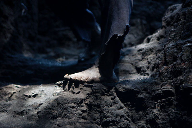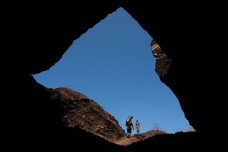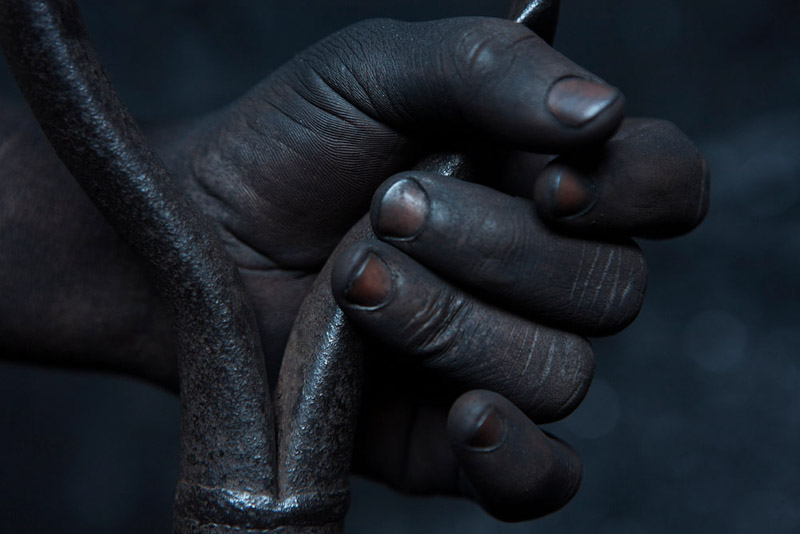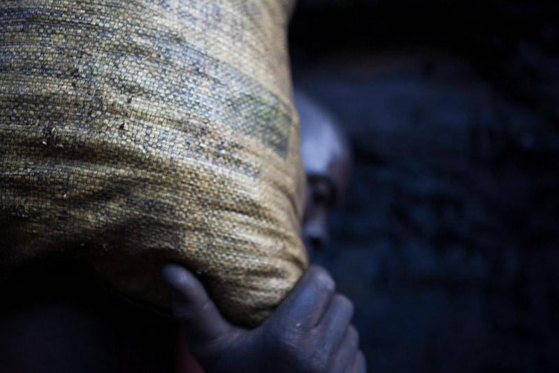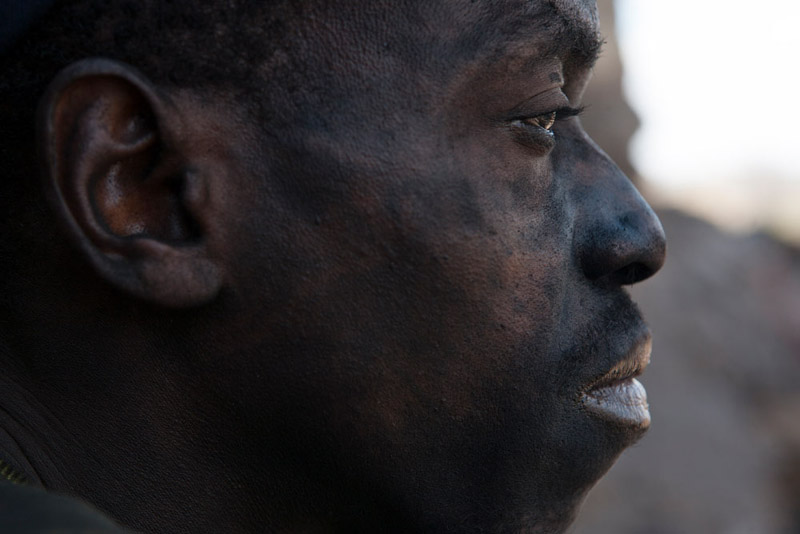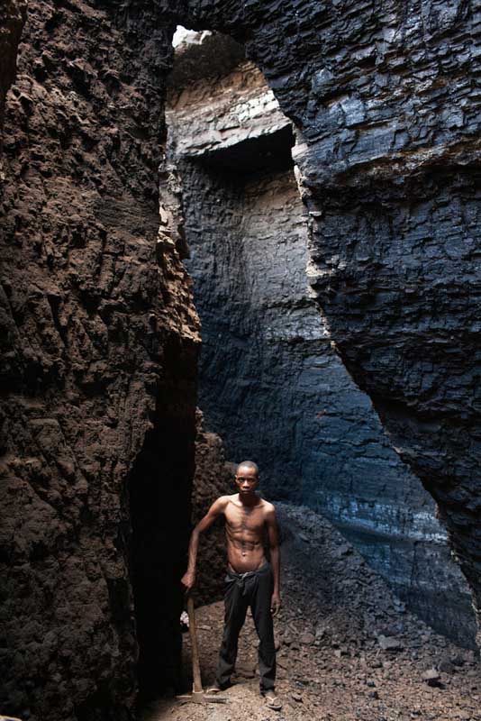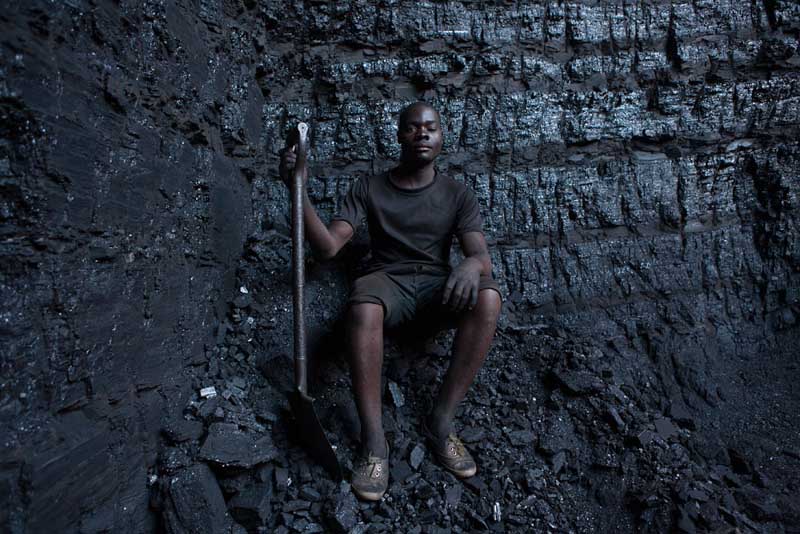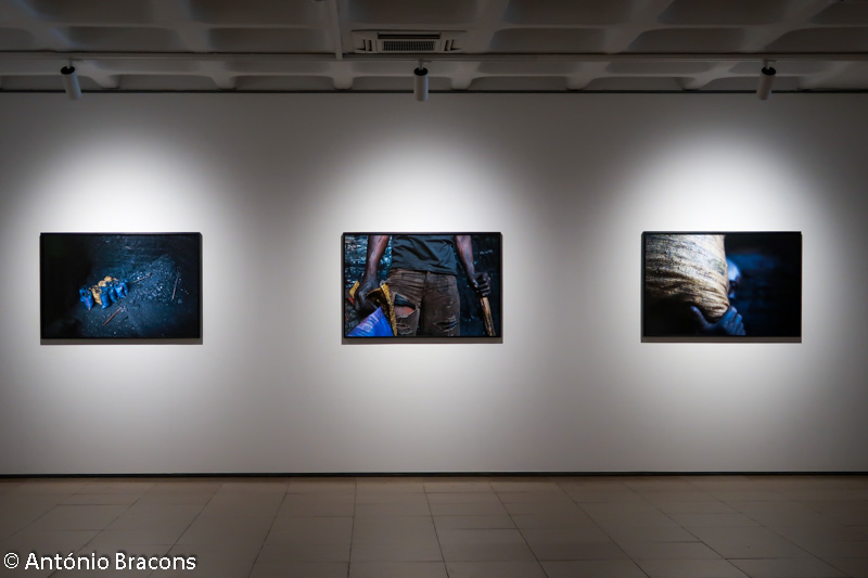 Esta é uma das razões para termos atenção aos títulos das suas obras, que não são óbvios no sentido de legendarem um retrato, porque são, de facto, maioritariamente entradas para um índice que se vai construindo como um inquérito sobre as pessoas e o meio onde vivem, a sua cultura, as condições de trabalho e da sua subsistência. Assim, o título desta série que vemos exposta, “Blackmoney”, é uma chamada de atenção para o valor da força do trabalho humano, que nos confronta ao observarmos figuras e fragmentos de corpos marcados pela violência e dureza da extracção de minério e de combustíveis fósseis, neste caso na província de Tete, em Moçambique. Mas estas imagens não ficam reféns de uma geografia retratada de forma episódica. Pelo contrário, são sinalizações da acção coerciva de políticas e intervenções empresariais que vão subtraindo, ali e noutras áreas do mundo, a sustentabilidade, a cultura e a dignidade humana como força necessária ao trabalho nas entranhas da terra. A terra é dura, poderosa na sua riqueza e trabalhada com artefactos e ferramentas manuais a que só a potência, quase exaurida, daqueles corpos concede ainda uma utilidade precária. Nas fotografias, de grande rigor visual e plástico, vemos os corpos modelados pela força extrema do seu labor, que nos vai revelando uma antropomorfia gretada e de olhar distante, como por exempto no excelente retrato de perfil, que perpetua a crueza do silêncio, mas possui simultaneamente uma grandiosidade que resgata a dignidade humana que resiste à negritude cintilante da terra cor de hulha. Desta forma, as fotografias da série “Blackmoney” podem ser entendidas como o dinheiro negro, numa tradução mais literal, que é o valor dos meios de trabalho para a extracção dos diferentes minérios. O valor das máquinas humanas, dos homens que sobrevivem à paisagem obscura, pontuada pelo brilho mineral que contamina as ferramentas, os rostos, os pés descalços, as mãos firmes e a caminhada de regresso à superfície, numa fotografia poderosa e subtil que nos reenvia, enquanto composição no campo da imagem, para o grande piano cinematográfico. Um homem sentado, aparentemente cego do olho esquerdo e apoiado numa pá, olha-nos com uma tranquilidade desarmante e resiliente.