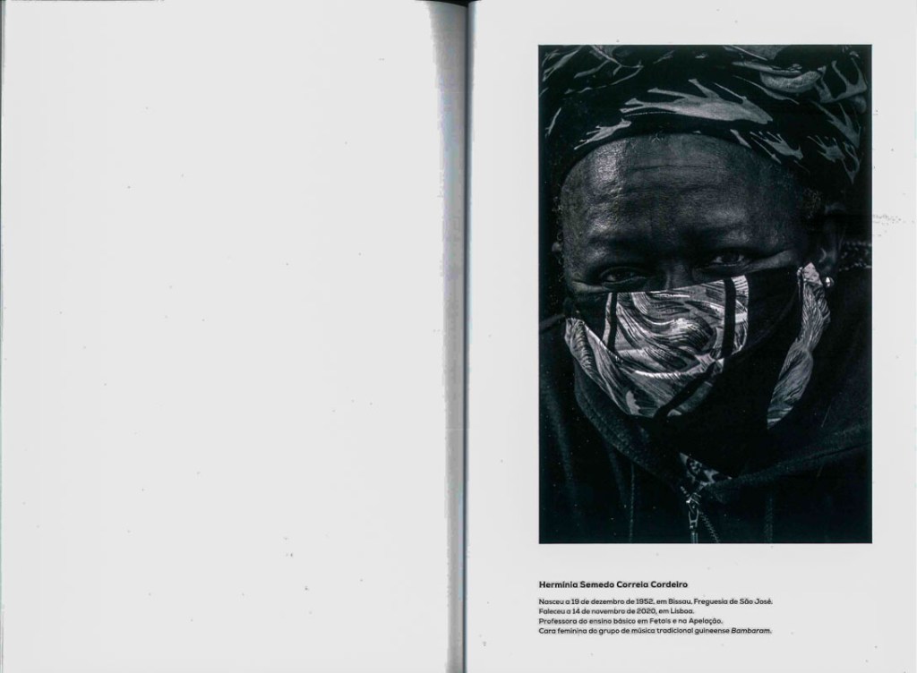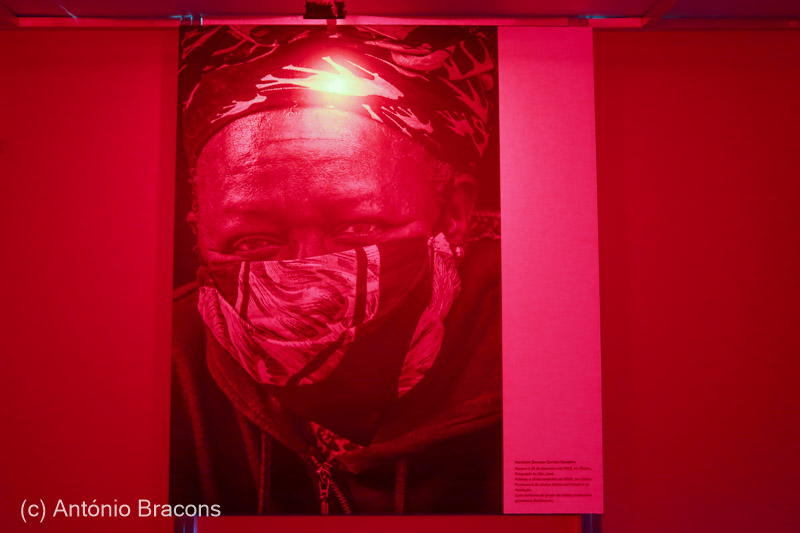 Nas paredes as imagens são no geral mais pequenas. E outras ao longo de uma faixa que envolve o módulo que acolhe um laboratório fotográfico (de exposição). No interior, com a luz vermelha, a fotografia que homenageia uma das habitantes do bairro, entretanto falecida, última fotografia do catálogo, a D. Hermínia Semedo Correia Cordeiro, guineense, professora do ensino básico em Fetais e em Camarate e “cara feminina do grupo de música tradicional guineense Bambaram”.