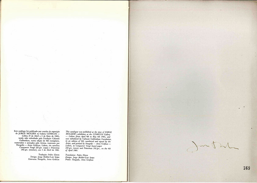 Este catálogo foi publicado por ocasião da exposição de JORGE MOLDER na Galeria CÓMICOS — Lisboa (9 de Abril a 4 de Maio de 1985), tendo sido subsidiado pela Fundação Calouste Gulbenkian, numa edição de 500 exemplares, numerados e assinados pelo Artista, impressos por Neogrifo — Artes Gráficas, Lisboa, em cartolina Conqueror Vergé 220 grs. (capa) e Printomat 250 grs. (interior), aos 4 de Abril de 1985.”