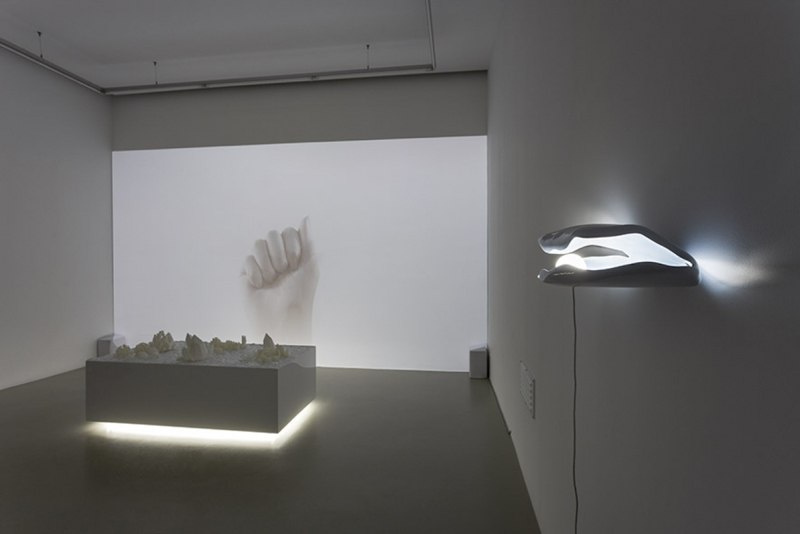 Borrachosa, artificial, limpa, flexível, leve, nova, monstruosa, cirúrgica, escorregadia, compressível, sexy, imperecível, luminosa mas sinistra, macia como silicone e como látex. A obra da artista propõe uma união entre o religioso, o arcaico, o profano e o contemporâneo. A representação de novas formas de ritualizar a nossa vida. Somos testemunhas desta união simbiótica entre mudras e uma forma assética e clínica de nos relacionarmos com a realidade. A matéria mediada pelo sintético. Uma nova semiótica: mão, borracha, objeto.