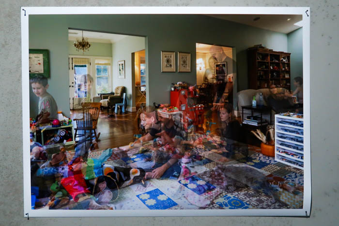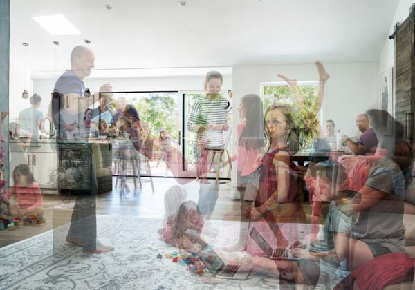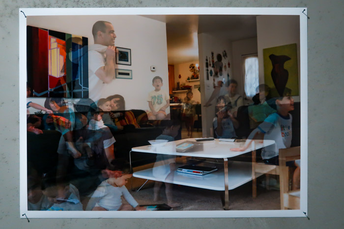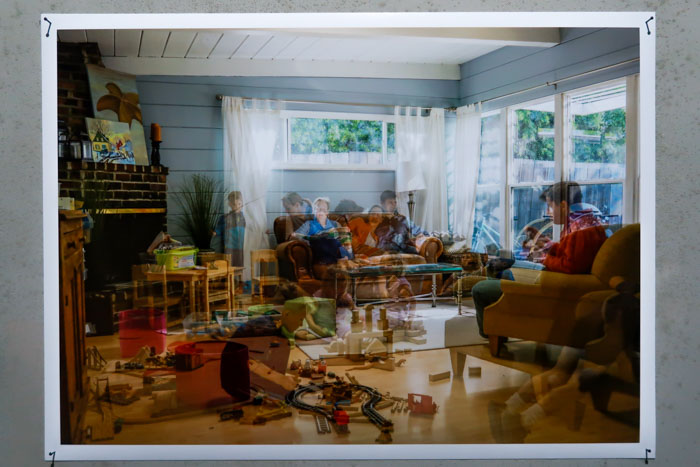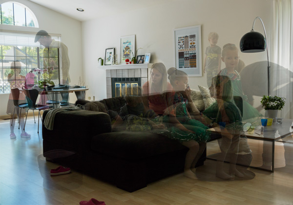 A sensação de lar tem a ver com memórias, intimidade e o apego que se tem a certos lugares. Na série, fotografo famílias nos seus lares. Várias fotografias, tiradas ao longo do tempo, sobrepõem-se e esbatem-se entre si. Na imagem final, o espaço permanece basicamente o mesmo, porém as ações e interações das famílias são captadas em diferentes posições, cada uma apresentando uma aparência efémera e fantasmagórica. Ao destacar a temporalidade do ser, as fotos tornam-se um testamento para os acontecimentos, aparentemente mundanos que muitas vezes, incluem memórias significativas. Como afirma Gaston Bachelard, no seu livro The Poetics of Space, “a casa tem unidade e complexidade, é feita de memórias e experiências, as suas diferentes partes despertam diferentes sensações e, ainda assim, é construída uma experiência de vida íntima e unitária.” Ao evocar sentimentos de nostalgia e perda, a cristalização das imagens, suspende brevemente o tempo, criando assim espaço para a reflexão sobre as próprias experiências e sobre as paisagens familiares das nossas memórias e lugares.