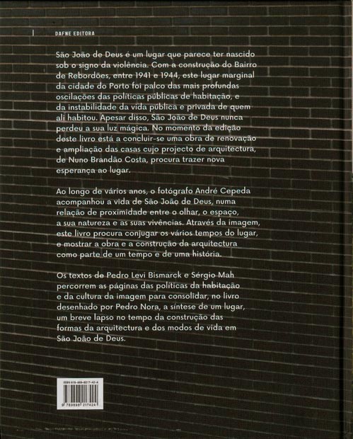 Neste livro, as fotografias antigas e recentes de André Cepeda combinam-se com a apresentação da proposta arquitectónica de Nuno Brandão Costa e uma aproximação à história da «questão da habitação» na qual São João de Deus se insere. A conjugação entre estas três componentes permite configurar um entendimento multifacetado e consistente sobre um processo de transformação, como também suscitar questões sobre a prática e o género da fotografia da arquitectura, designadamente sobre o papel e o alcance que a imagem tem e pode ter na representação da arquitectura e do planeamento urbano, bem como das suas ressonâncias históricas, sociais e antropológicas.