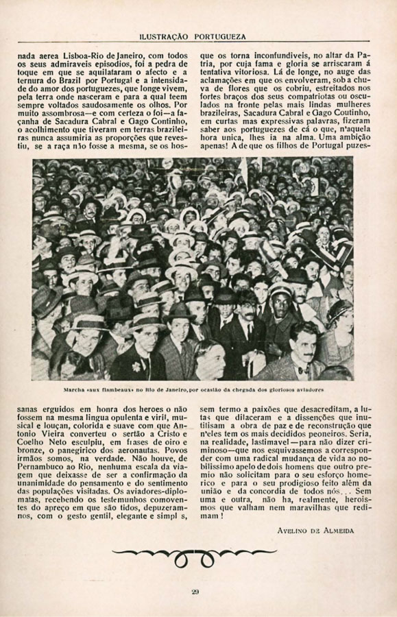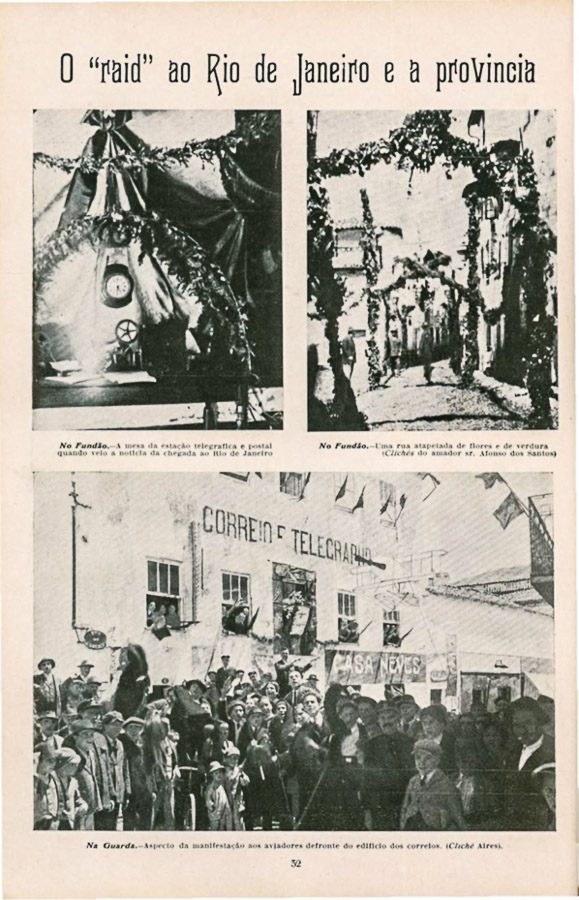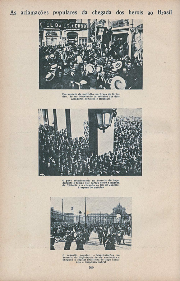 No Rio de Janeiro, “A população da cidadefez a apoteose magnífica do heroísmo, aclamando Gago Coutinho e Sacadura Cabral na mais espontânea, na mais eloquente, na mais grandiosa manifestação popular em que há memória no Brasil”, escreve-se n’ “O Paiz”, de 18 de junho de 1922. 2