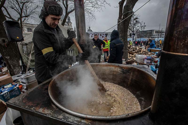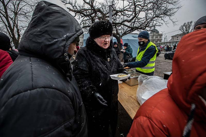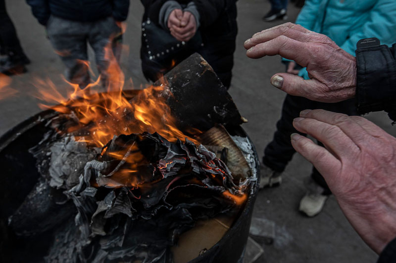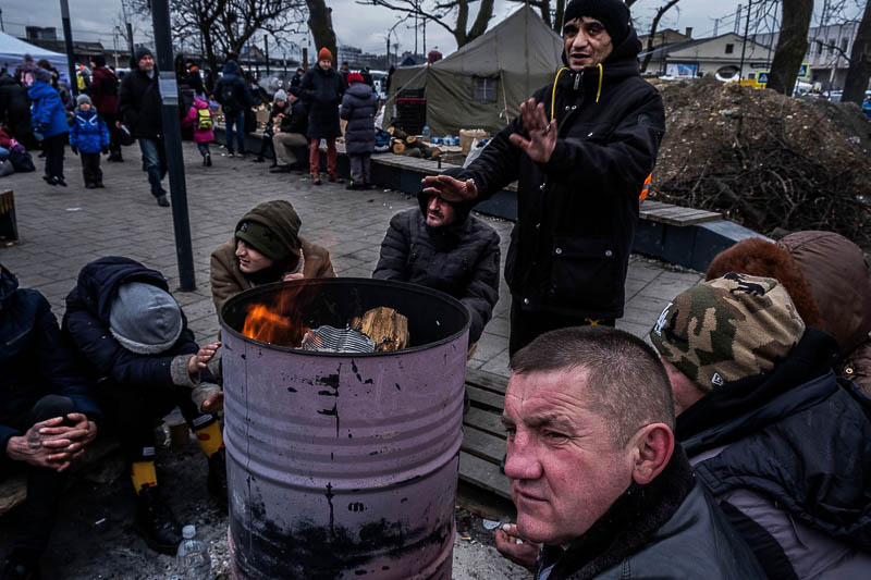 Uma máquina estranha. Alimentada a lenha e fogo. Parece de outra guerra bem penosa. A guerra dos nossos bisas e avós. Homens sujos aquecem água. Muito chá quente é necessário. Fazem sopa. Bolachas também há. Tendas azuis são agora pequenos hospitais. Outras, salões aquecidos. O ar é abafado. Mulheres, crianças e homens velhos procuram aconchego. As filas são enormes. Uns querem partir. Outros acabam de chegar. São milhares de seres humanos. Organizados. Serenos. Sempre com as lágrimas nos olhos. Depois, existem os outros. Os sem-abrigo. Aquecem as mãos e os pés em bidons com lenha a arder e fumo benzido. Matam a fome. E depois os outros. Os ciganos. Fugitivos. Mal agasalhados. Tentam matar a fome. Quando deixam. Poderão cair bombas. Dificilmente serão contabilizados.