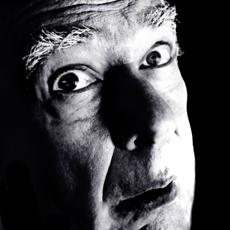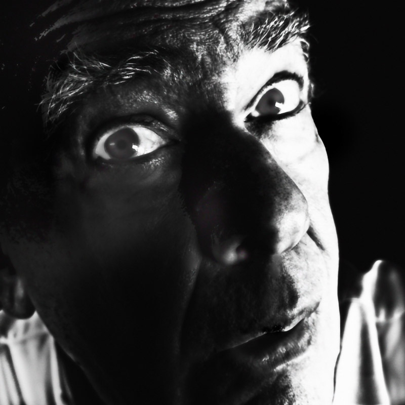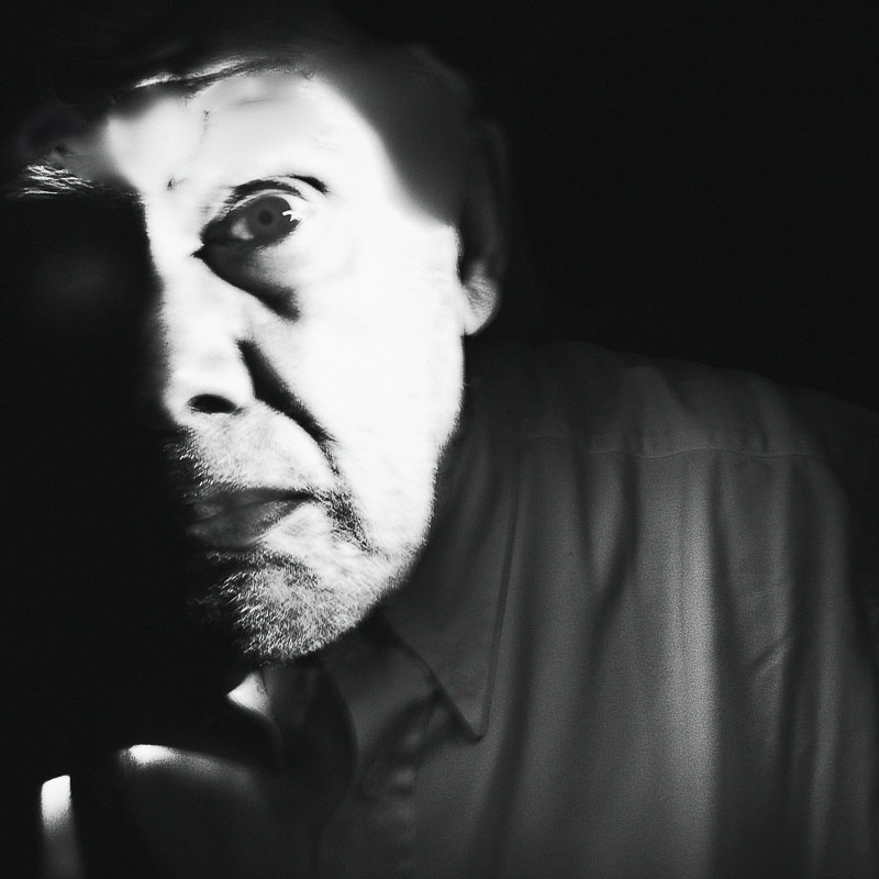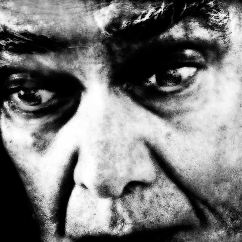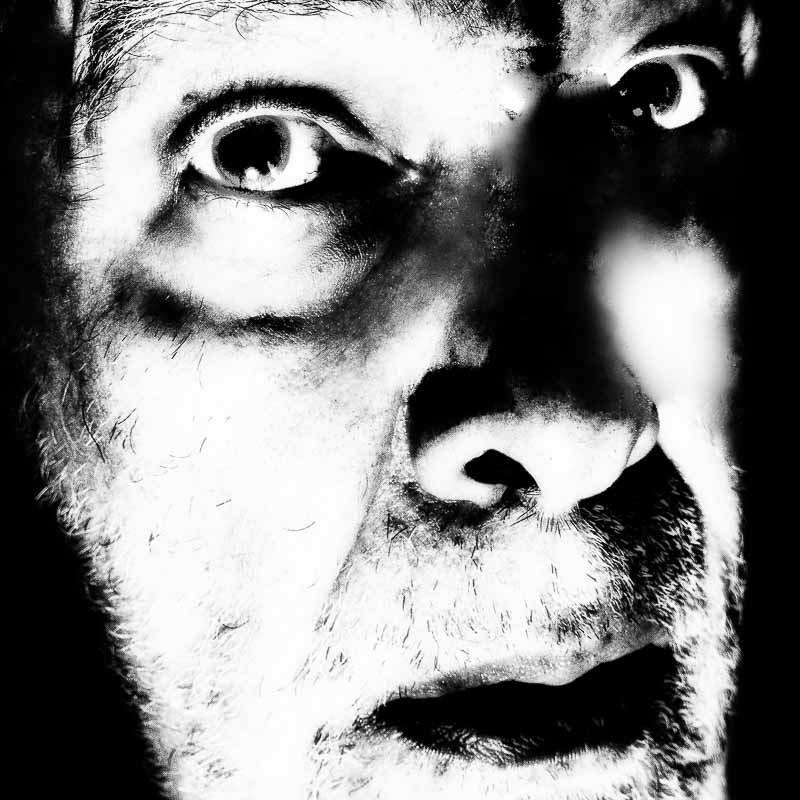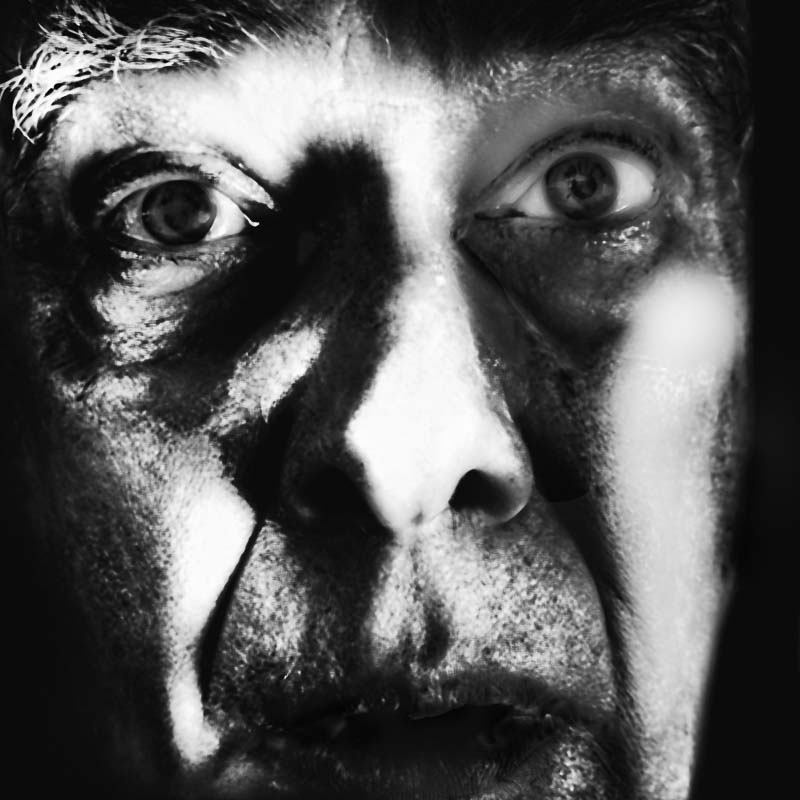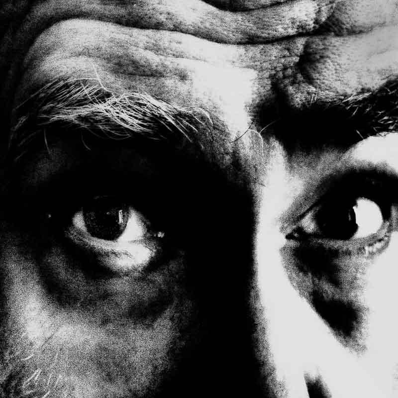 Em Grandes Planos (2023), é o rosto ou parte dele que vemos. E que nos vê. Diferentes expressões, diferentes olhares, sentimentos, memórias… Fotografada ao longo do reduzido tempo de quatro meses, os diferentes aspetos e expressões são densificados por mais ou menos luz, mais ou menos nitidez, a barba feita, por fazer ou mais crescida, mais branca ou mais escura, a forma como nos olha, como se posiciona. Nalgumas, parece-me mais novo, noutras, mais velho. As imagens são digitais, fotografas pelo próprio retratado, sem recorrer a assistentes, jogando com a iluminação e com tratamento digital. A dimensão da imagem leva a um ponteado na definição de alguns traços e manchas.