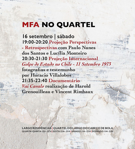 Acima encontra-se o programa geral da MFA. Em 12/9, a MFA foi prolongada até domingo, 17/9 (ver abaixo o programa dos dias 14 a 17). O programa previsto para 5.ª feira, 14/9 passou para sábado, 16/9.