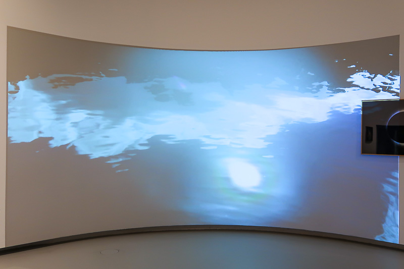 Há uma cortina de água que nos recebe ou através da qual nos despedimos do universo em que a exposição Da calma fez-se o vento nos mergulha. A sala permite uma visão global, simulando uma panorâmica dentro da qual avançamos ou recuamos, observando sucessivos capítulos – não hierarquizados nem sequenciais – de uma história em imagens que nos é dada em fragmentos, em micronarrativas, permitindo-nos a liberdade de um percurso fluido e de uma interpretação livre.