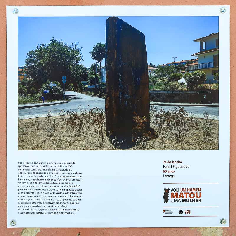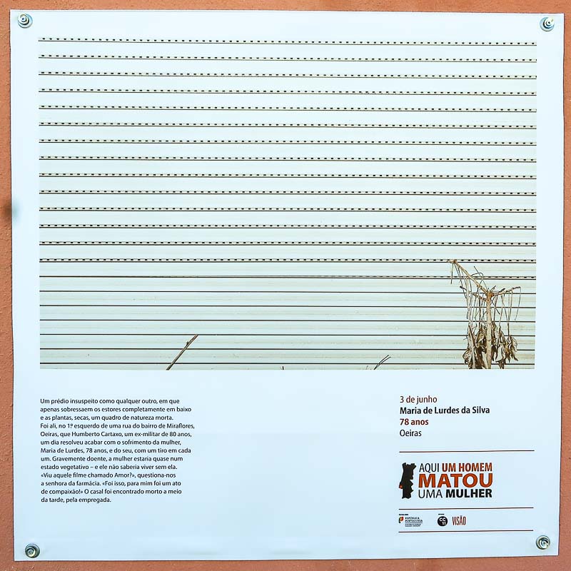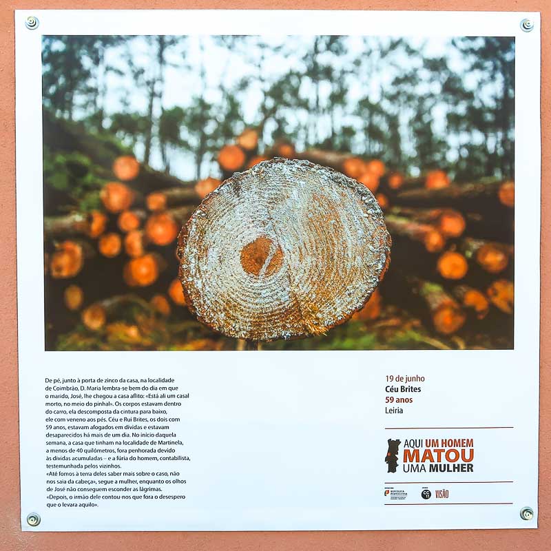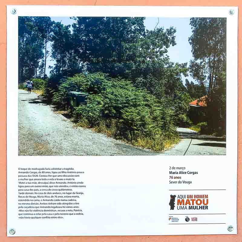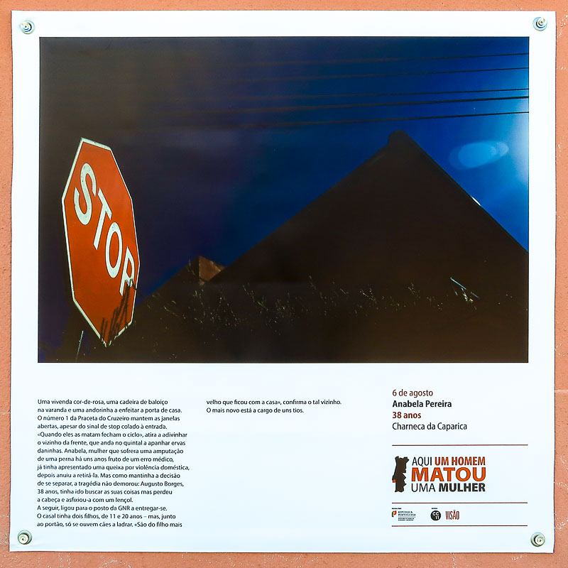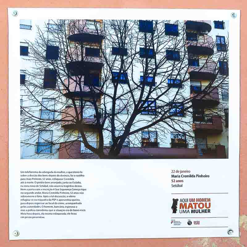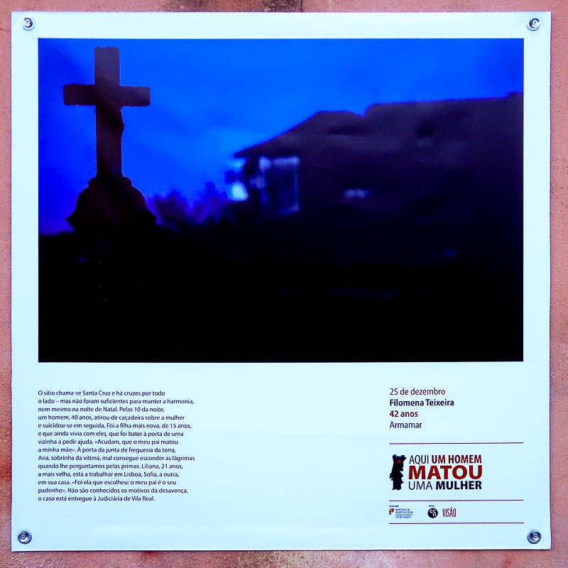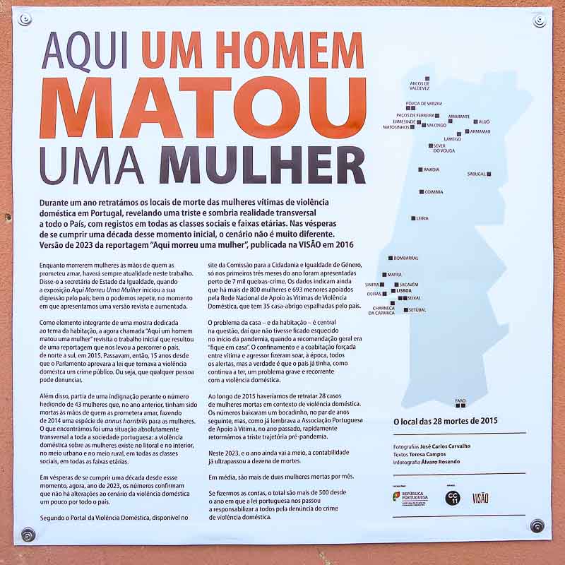 Como elemento integrante de uma mostra dedicada ao tema da habitação, a agora chamada “Aqui um homem matou uma mulher” revisita o trabalho inicial que resultou de uma reportagem que nos levou a percorrer o país, de norte a sul, em 2015. Passavam, então, 15 anos desde que o Parlamento aprovara a lei que tornava a violência doméstica um crime público. Ou seja, que qualquer pessoa pode denunciar.