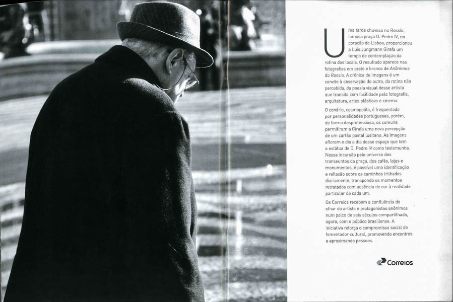 Uma tarde chuvosa no Rossio, famosa praça D. Pedro IV, no coração de Lisboa, proporcionou a Luis Jungmann Girafa um tempo de contemplação da rotina dos locais. O resultado aparece nas fotografias em preto e branco de Anônimos do Rossio. A crônica de imagens é um convite à observação do outro, da rotina não percebida, da poesia visual desse artista que transita com facilidade pela fotografia, arquitetura, artes plásticas e cinema.