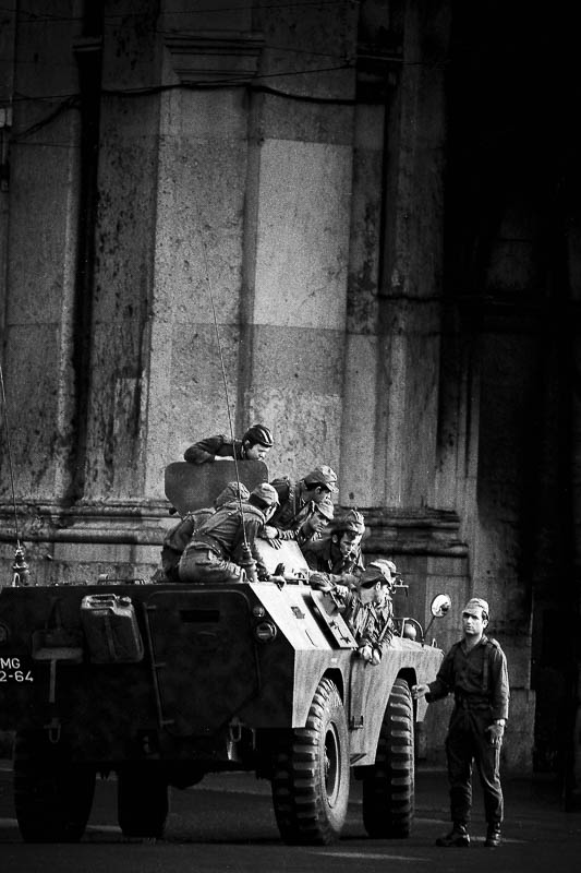 A professora mandou‑nos calar e estava a tentar sintonizar o rádio. A determinada altura recambiou‑nos a todos para casa. É tudo o que me lembro desse dia. Tinha 6 anos, estava na 1.ª classe, e pertenço à geração que, nas décadas seguintes, foi acusada de ter perdido o 25 de Abril. Só lá para as eleições de 1980, com uns sólidos 12 anos, é que estava politizado o suficiente para entrar na luta partidária, como era costume na época. Tinha perdido a festa. Mas então o que estou a fazer neste projeto? É que tenho vários 25 de Abril. Este é o meu favorito: estou na Amadora, são 3 e tal da manhã e ouço pela primeira vez na vida o «Riders in the Storm», dos Doors. Lá para as 4 e tal começam a dizer que algo se está a passar em Lisboa. Visto‑me e decido ir para o Século. Vou para a estação. Passo pelo bairro de lata da Falageira, uma das vistas mais miseráveis dos subúrbios de Lisboa e que tenho fotografado nos últimos anos. Chegado à estação do Rossio, corro até ao Bairro Alto, à redação do Século, e saco o maior número de rolos possível. Uns 40. São umas 6 da manhã. Está lá o Mário Zambujal, que destaca o jornalista Mário Contumélias e a mim para seguirmos para o Terreiro do Paço. Só lá para as 9 e tal é que tenho a primeira conversa com o Salgueiro Maia. Vê‑me fotografar e pergunta‑me o que estou ali a fazer. Digo que sou do Século. Pergunta‑me se sou dos deste lado ou dos outros. Não sei bem o que dizer e respondo que estou ali daquele lado a fotografar. Então ele diz‑me para passar a barreira e não ficar escondido.