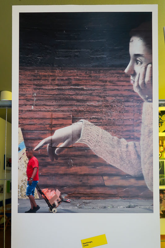 Rui Fiolhais leva-nos a múltiplas cidades, em 46 países. Olha para as paredes, para as intervenções de street art, focando-se por vezes nos detalhes de um mural, mas regra geral, numa parte dessa pintura / parede e na sua relação com o transeunte. Ou o próprio transeunte.