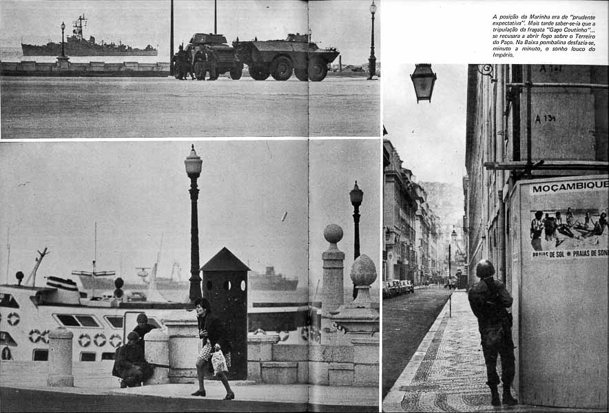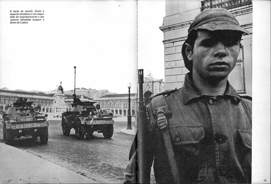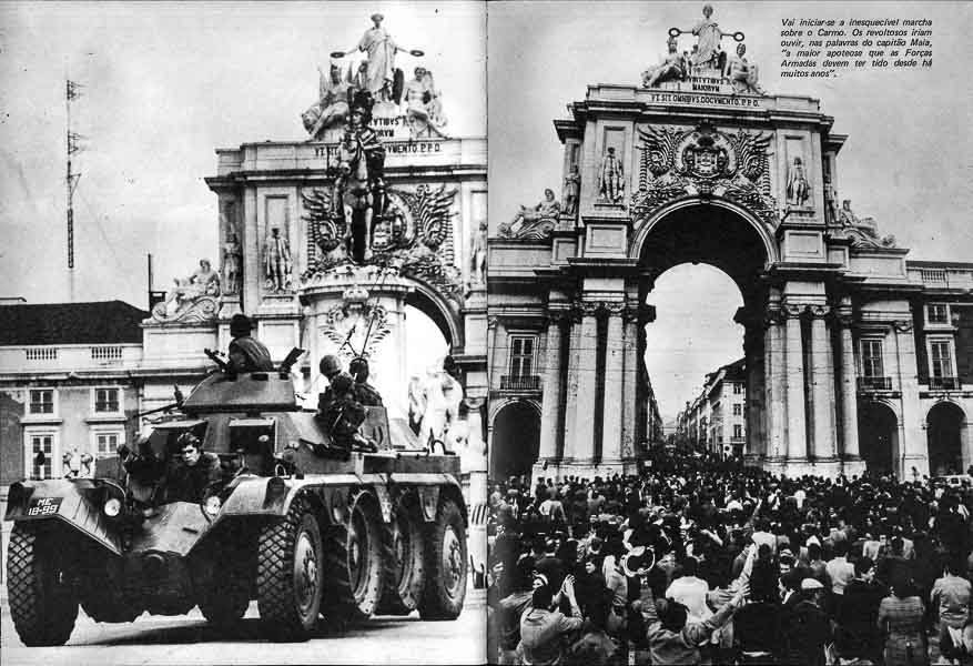 À mesma hora, em Lisboa, uma força da Escola Prática de Cavalaria de Santarém preparava-se para se dirigir ao Largo do Carmo, em cujo quartel, constava, se refugiara o presidente do conselho, Marcelo Caetano. Muito povo nas ruas da Baixa. Alguns jornalistas tinham conseguido ultrapassar a Barreira dos tanques e atiradores de Infantaria e subiam agora para uma viatura militar à descoberta, posta à sua disposição pelo comando da força que ocupava o Terreiro do Paço desde as cinco e trinta desse dia 25 de Abril de 1974.