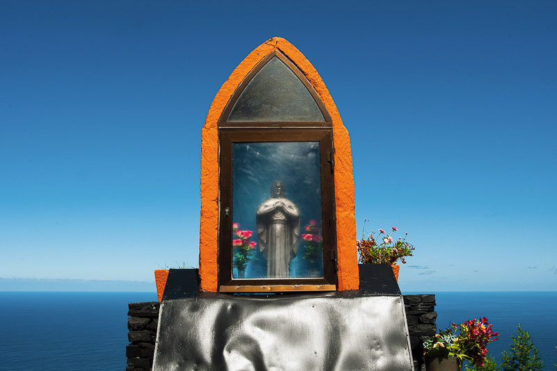 Pois o autor mostra-nos, em cada fotografia e no seu todo, um presente no passado moldado: os ecos da crença motriz no Deus que socorre e alumia, que nos fez calcorrear mares e amarinhar montes e vales. Omnipresente na Sua tutela, sê-lo-á. Mas também um Deus portátil, aposto em cada peça, modesta ou monumental, pública no seu a céu aberto ou esconsa no fundo de uma gruta. Assim condensado para que não O ignoremos, para que a Ele queiramos acorrer, tanto em dias desesperados como nos da esperança dadivosa. No desamparo, no amparo. Na eterna dor, na fugaz alegria.