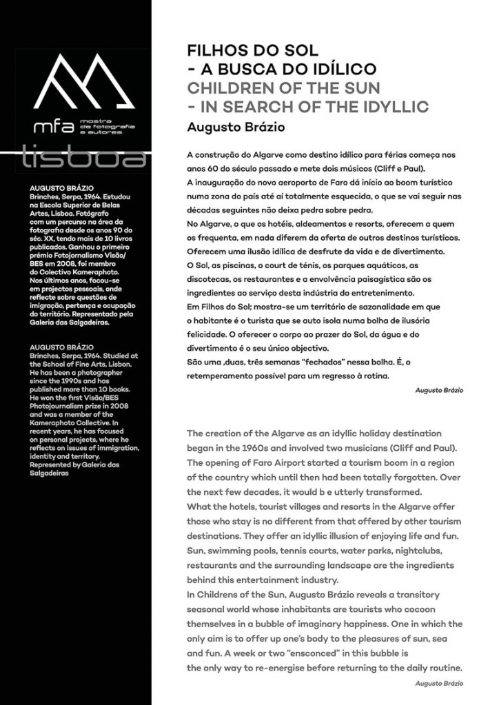 “Filhos do sol – A busca do idílico”, de Augusto Brázio, mostra-nos o Algarve como um território de sazonalidade em que o habitante é o turista que se auto isola numa bolha de ilusória felicidade.