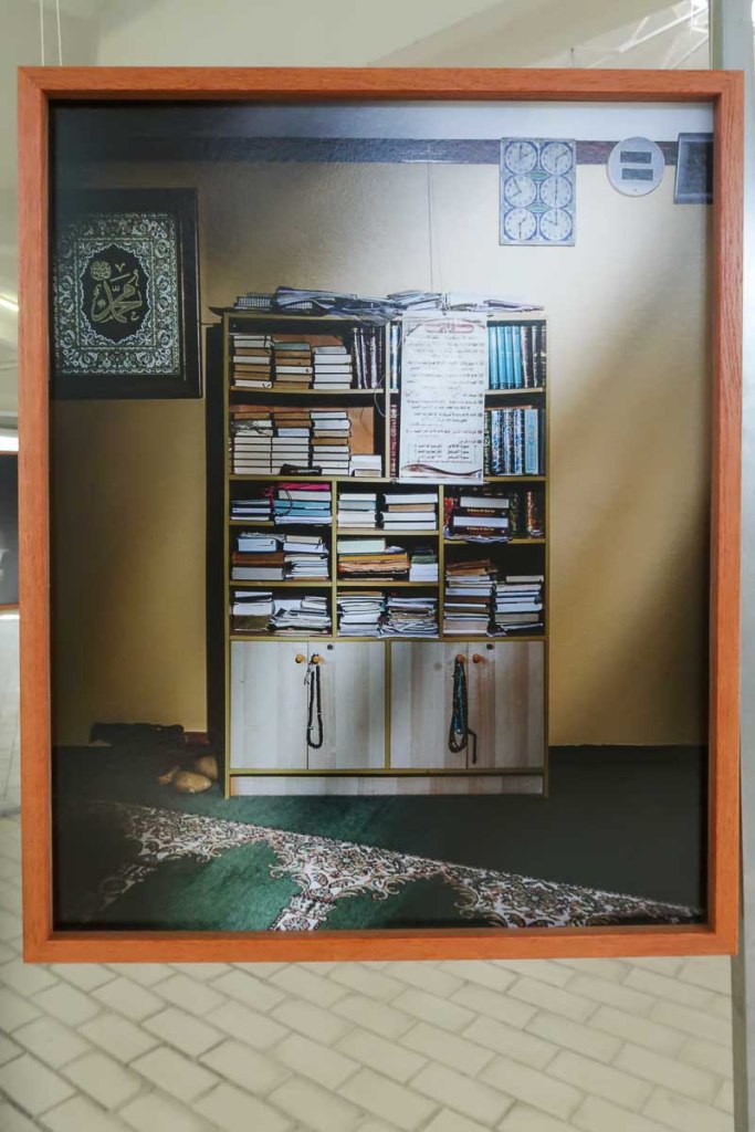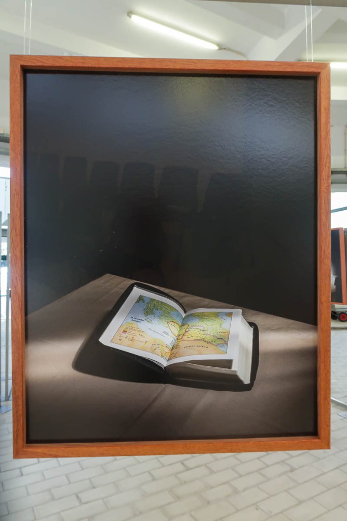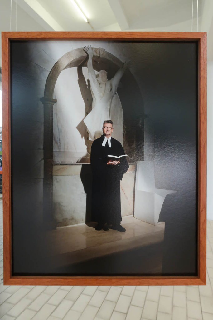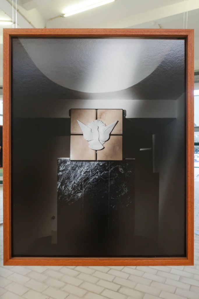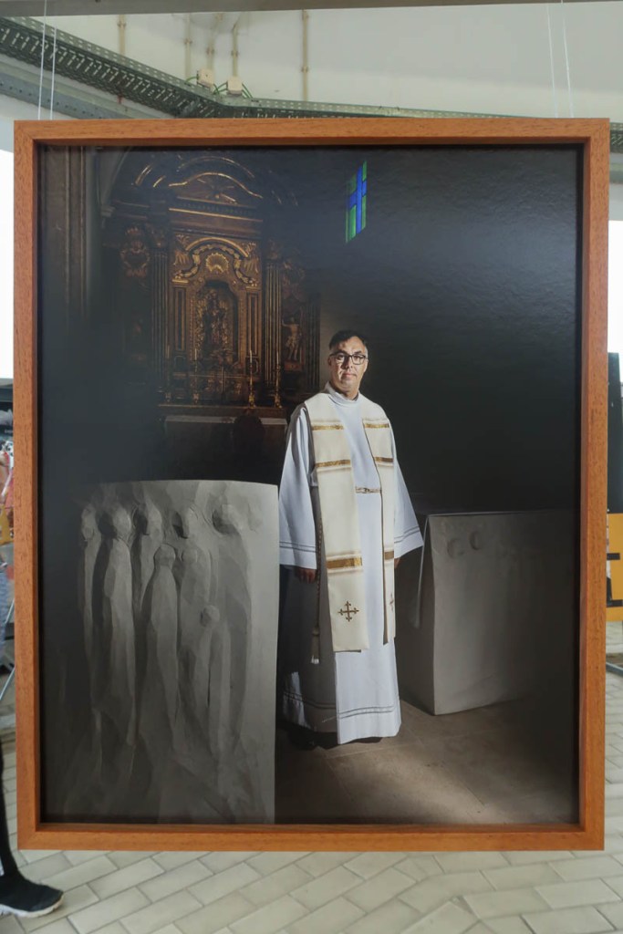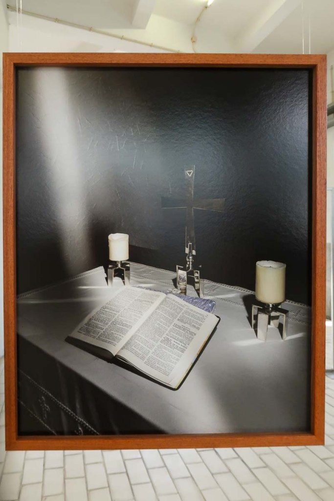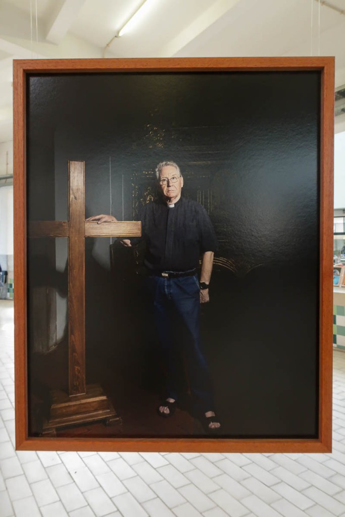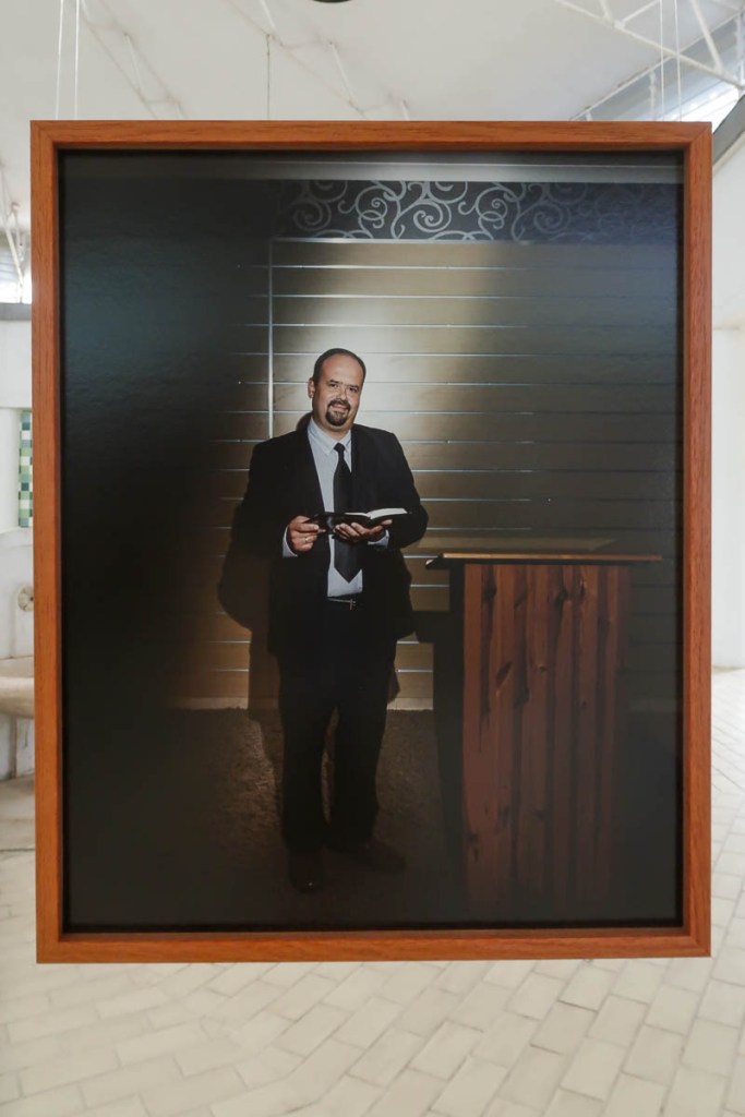 Exposta em círculo, cada estrutura apresenta duas fotografias de um mesmo credo: para o interior o rosto do padre, do pastor, do celebrante; para o exterior, um detalhe do templo e de sinais de devoção desse mesmo credo.
