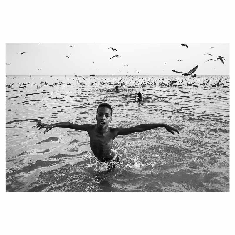 O que me chamou imediatamente à atenção nas suas fotografias foi a sua composição. Ele tem a capacidade de captar várias cenas no mesmo enquadramento, algo que só os mestres da fotografia têm. Imagens como a que retrata um miúdo no mar, de braços abertos, rodeado de gaivotas, ficam na memória para sempre.