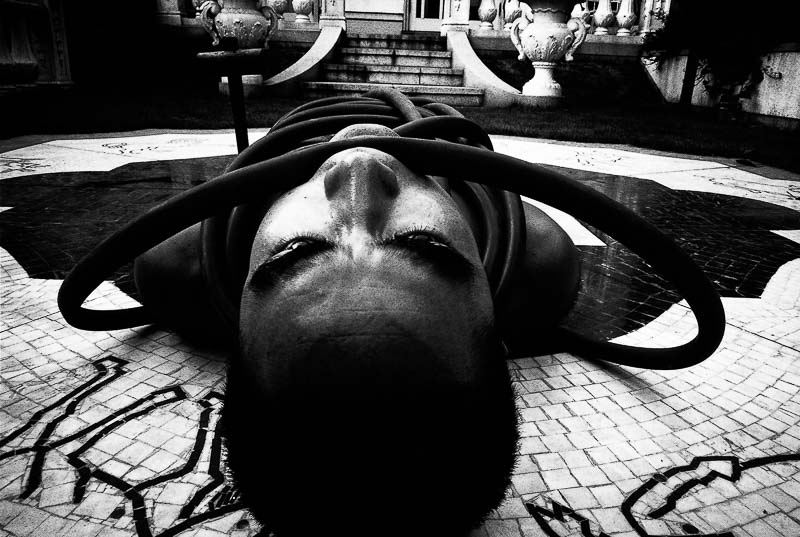 Mishima considerava o corpo um “jardim da mente” que era preciso tratar e cultivar, tal como o faz qualquer lutador ou bailarino que pratique artes marciais. Na raiz da notável colaboração Hosoe-Mishima está a estética cruel do ‘corpo morto’, introduzida pela nova dança (das trevas) butô, criada por Tatsumi Hijikata e Kazuo Ohno nos anos 1950 em resposta à dialética das culturas americana e japonesa do pós-Guerra. Se o pretexto era uma foto para a capa de um livro de ensaios de Mishima, o jovem Hosoe percebeu imediatamente que tinha ali um corpo à sua disposição. Conheceram-se no jardim da casa do escritor (que se banhava ao Sol, enquanto o pai regava as flores). Uma das primeiras fotos mostra Mishima manietado pela mangueira; noutra, fita-nos intensamente com uma rosa nos lábios. A sensualidade mórbida do corpo humano! A crueldade apetecível da beleza…