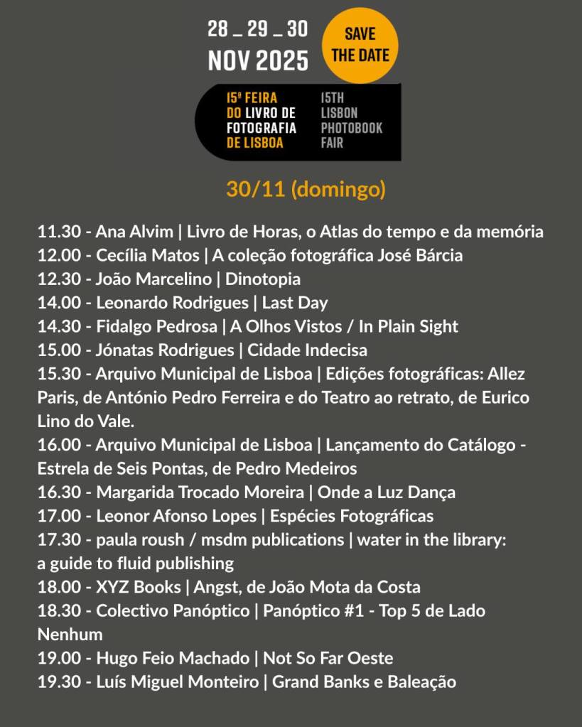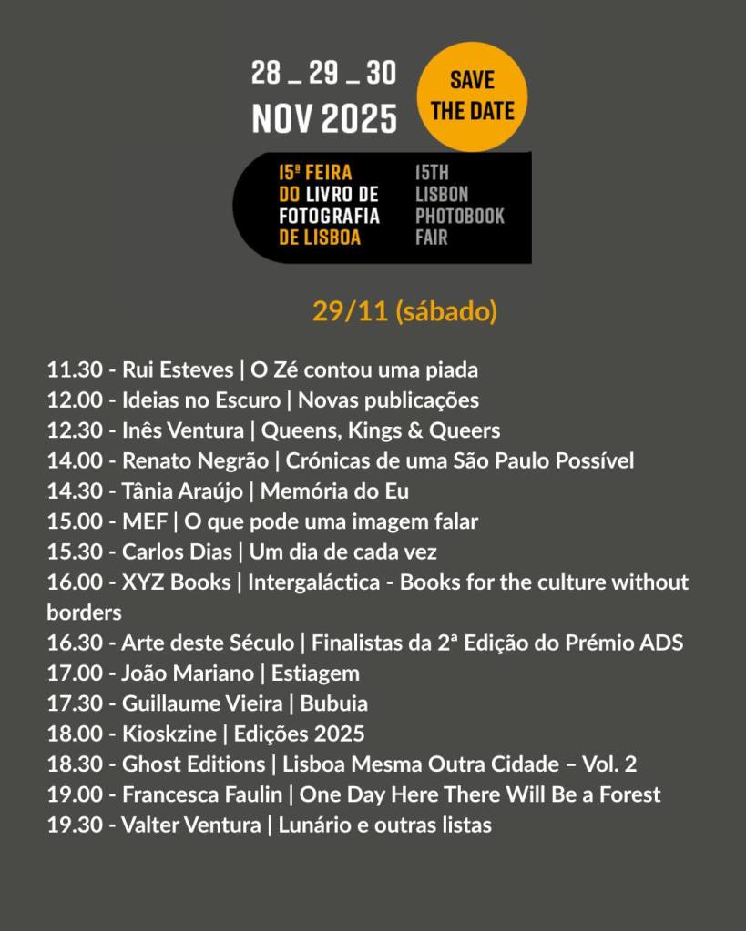 Mercado de Fotolivros (Sala de Leitura) – Livrarias: Alexandria Livros (Alfarrabista), Atilhó – alfarrabista, STET; Editoras: Arquivo Municipal de Lisboa – Fotográfico, Arte Deste Século, Atelier de Lisboa, Ghost Editions, Hélice_press, Ideias no Escuro, KioskZine, MEF-Movimento de Expressão Fotográfica, Olhavê, PvK – Pierre von Kleist, Procurar.te, XYZ Books